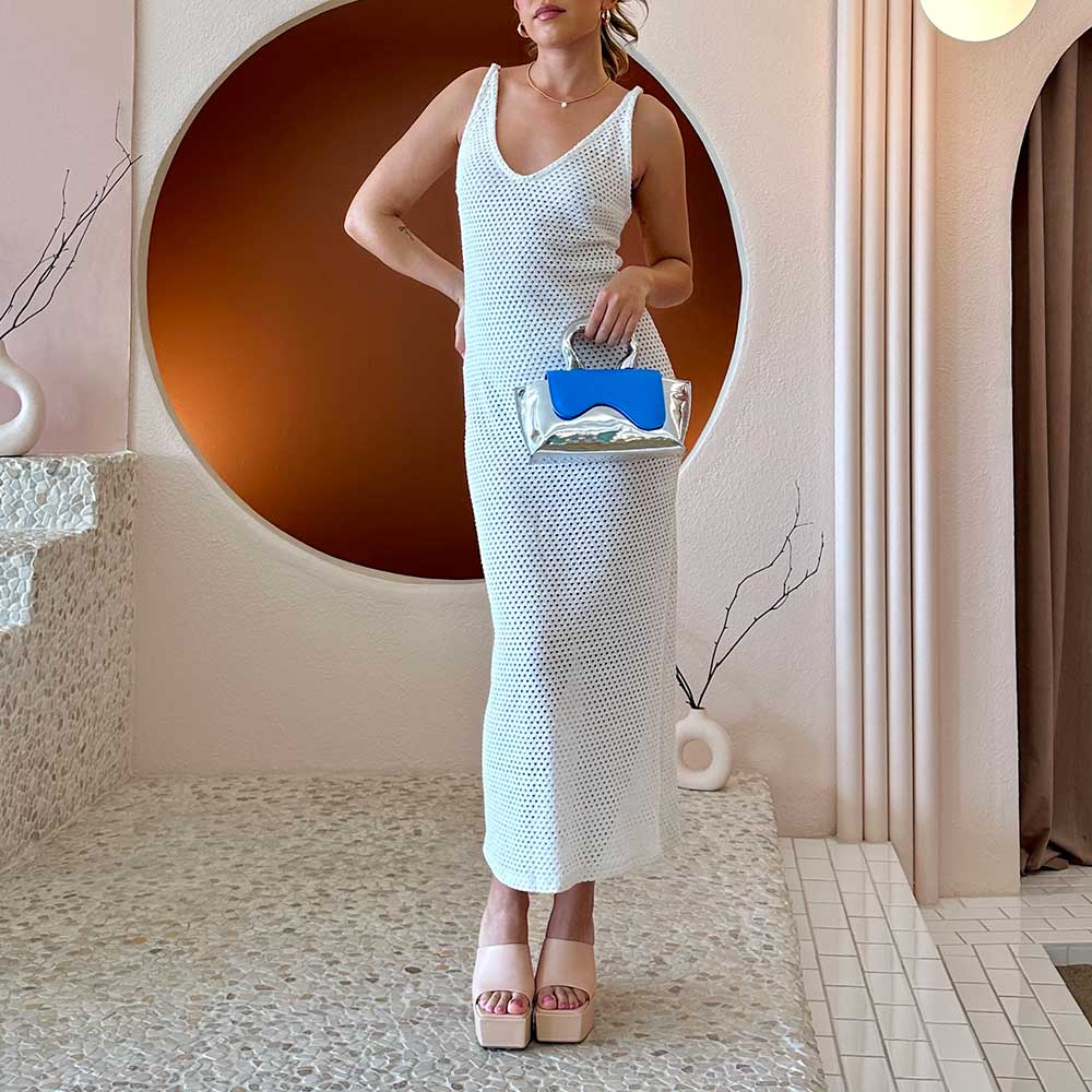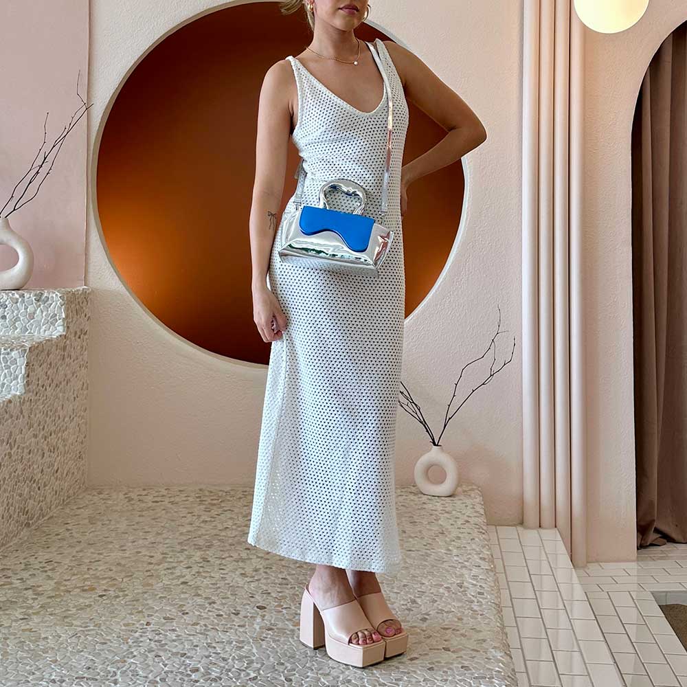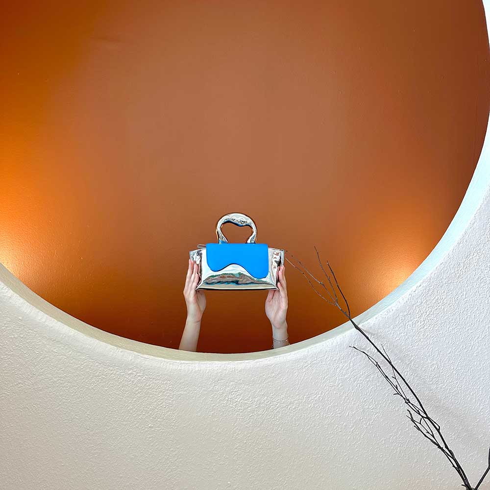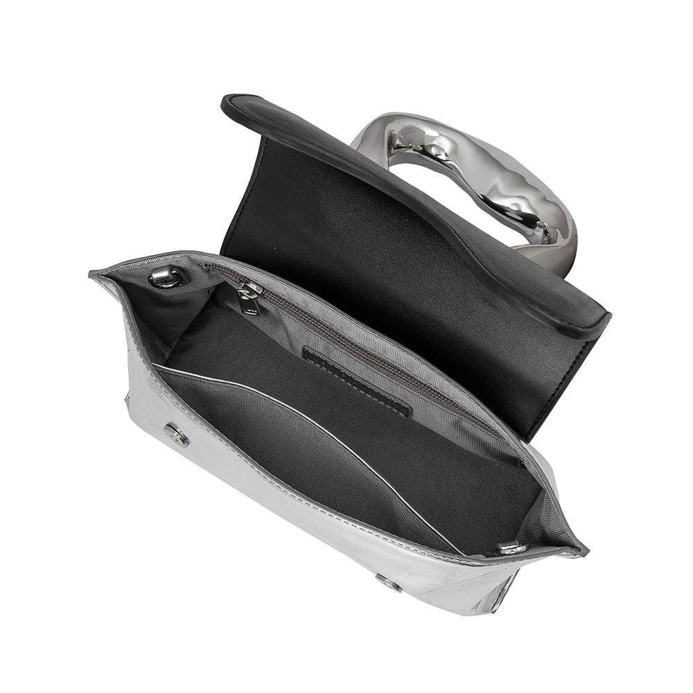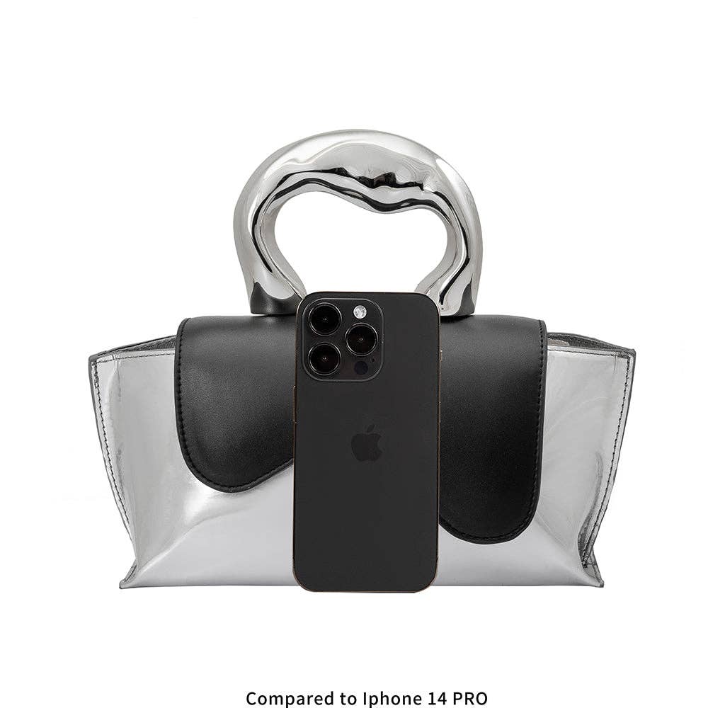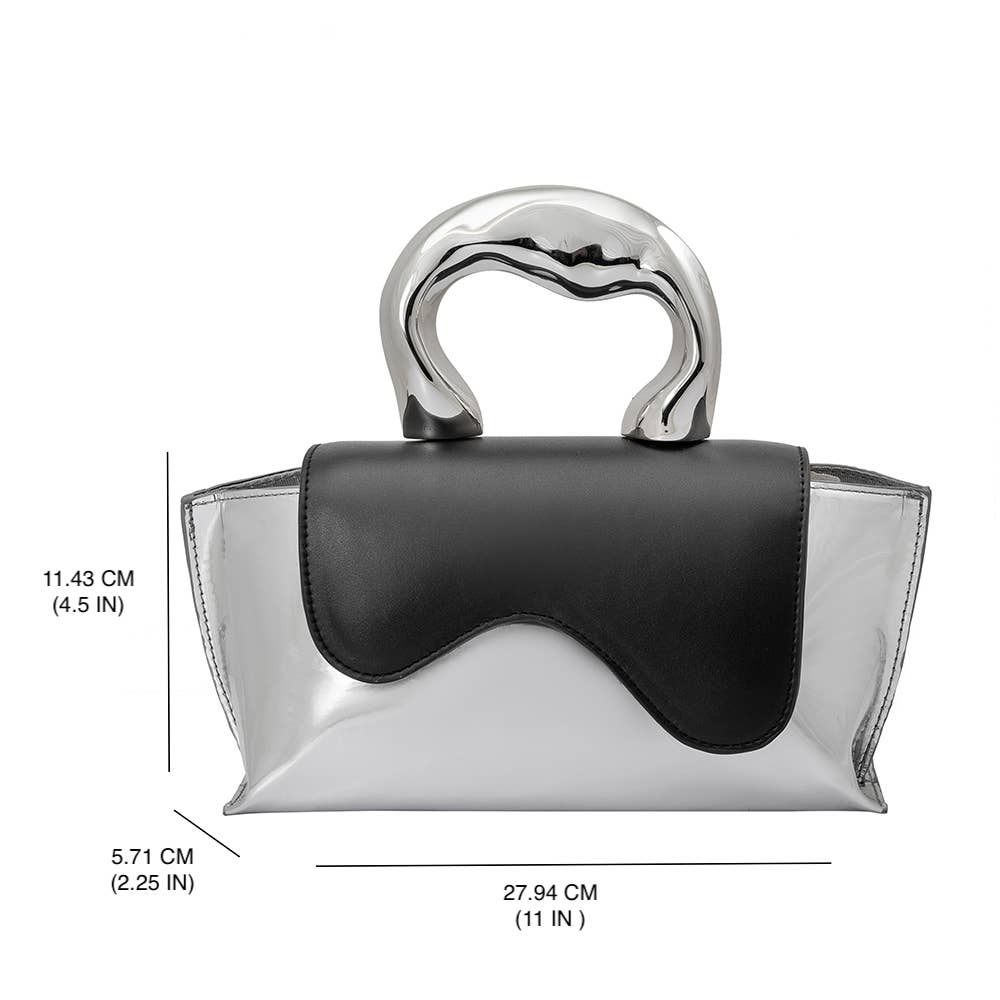 Meet Akari one of the most unique and intricate handbags you will find. Made out of recycled vegan leather this metallic top handle bag makes a fashionable yet sustainable statement piece. Wear it comfortably as a crossbody bag using the adjustable strap for hands-free convenience. * Recycled Vegan Leather * 11" W x 4.5" H x 2.25" D * Handle Drop: 2.5" * Strap Length: 38-44.5" * Zipper Closure * Silver-Tone Hardware * Interior Slip & Zip Pocket * OEKO-TEX Certified Lining * Fits up to an iPhone 14 Pro * Product No.YN7725K
