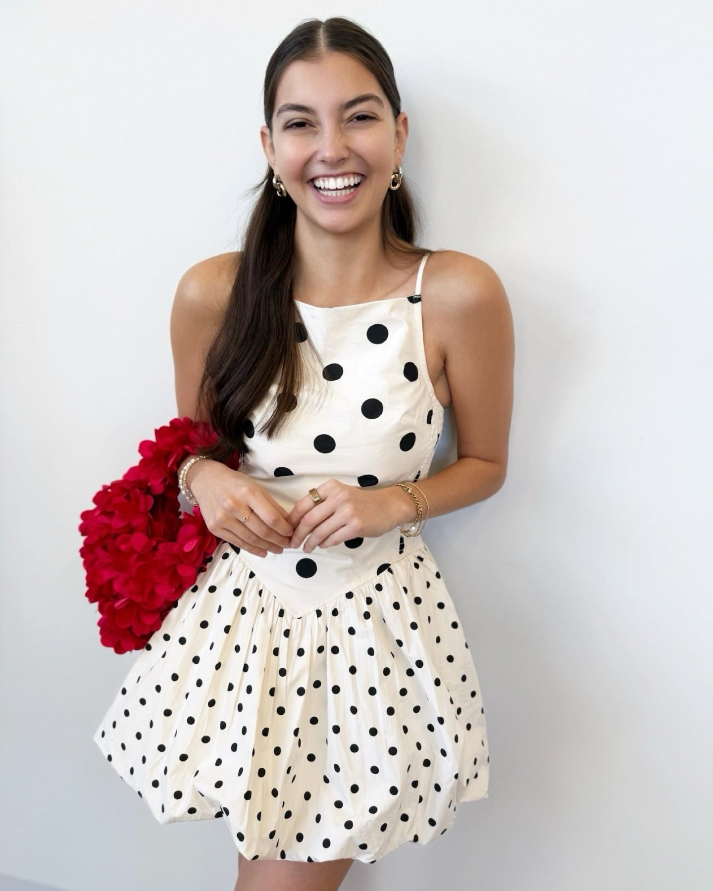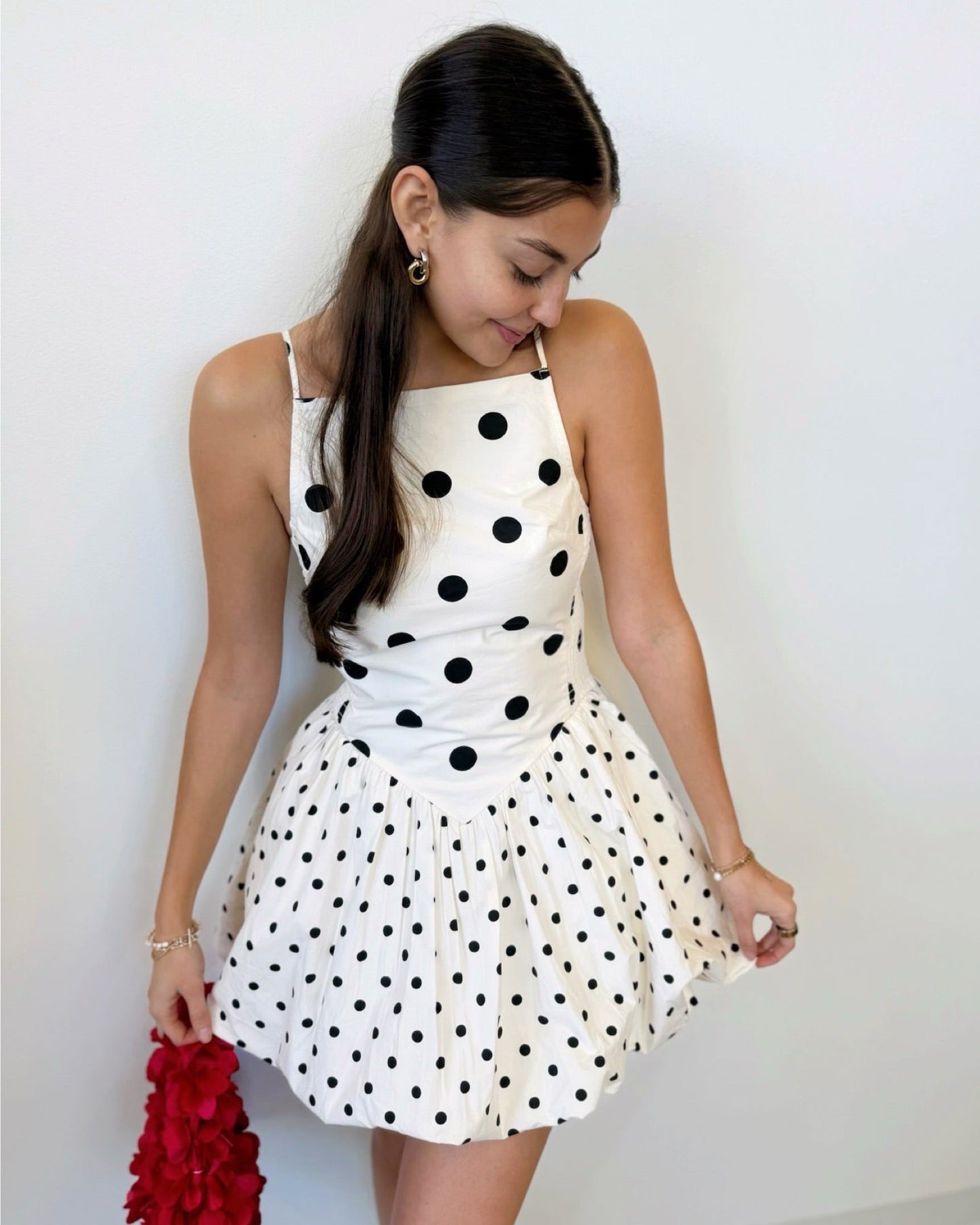 This sleeveless mini dress combines contemporary design with thoughtful construction. The black polka dot print provides timeless appeal, while an angled detail seam creates a flattering drop waist silhouette. A bubble hem adds movement and dimension to the hemline. Smocked side panels offer comfortable stretch and give, and adjustable back straps allow for a customized fit. A discreet zipper closure completes the polished look.