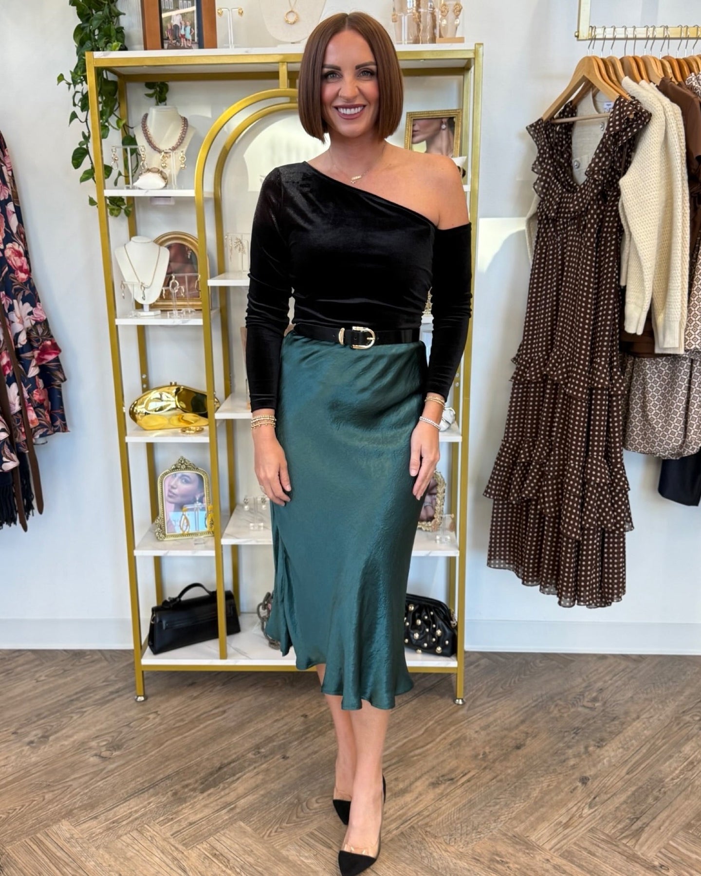 Elevate your holiday wardrobe with the Éwoyn Bias Skirt, a stunning midi-length piece crafted from lustrous emerald satin. Its bias cut drapes elegantly, flattering every silhouette while adding a touch of effortless sophistication. Perfect for festive gatherings or evening events, this skirt combines comfort with timeless style to make you stand out with subtle luxury.
