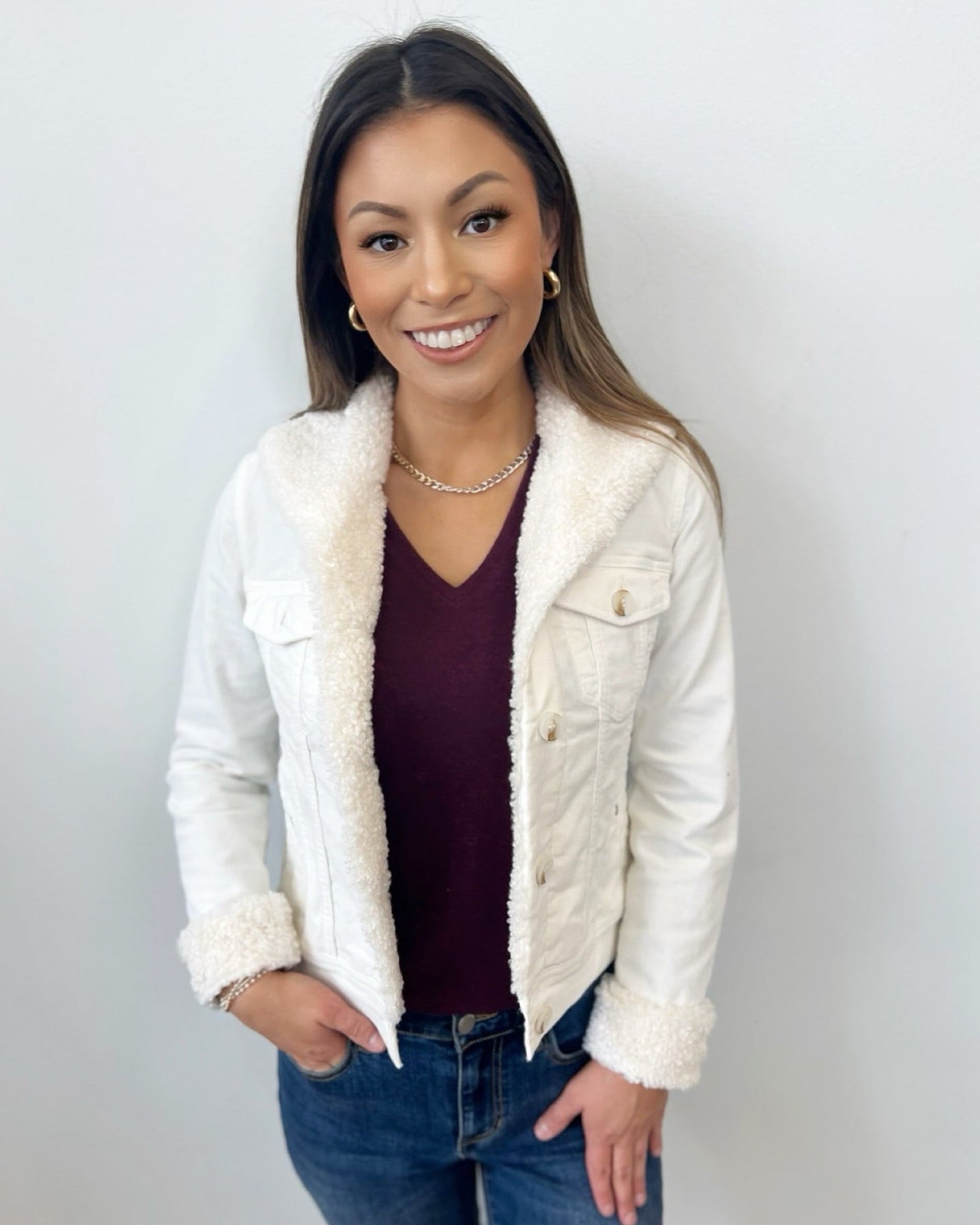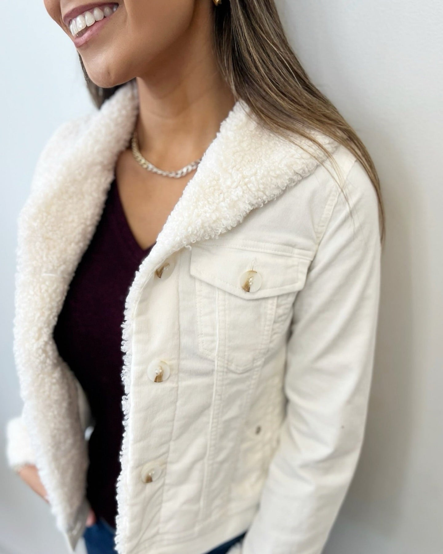 This shorter corduroy utility jacket features a soft serpa insert and collar, blending rugged style with cozy comfort. Perfect for layering, it offers versatile warmth and a modern, tailored fit that elevates any casual outfit.