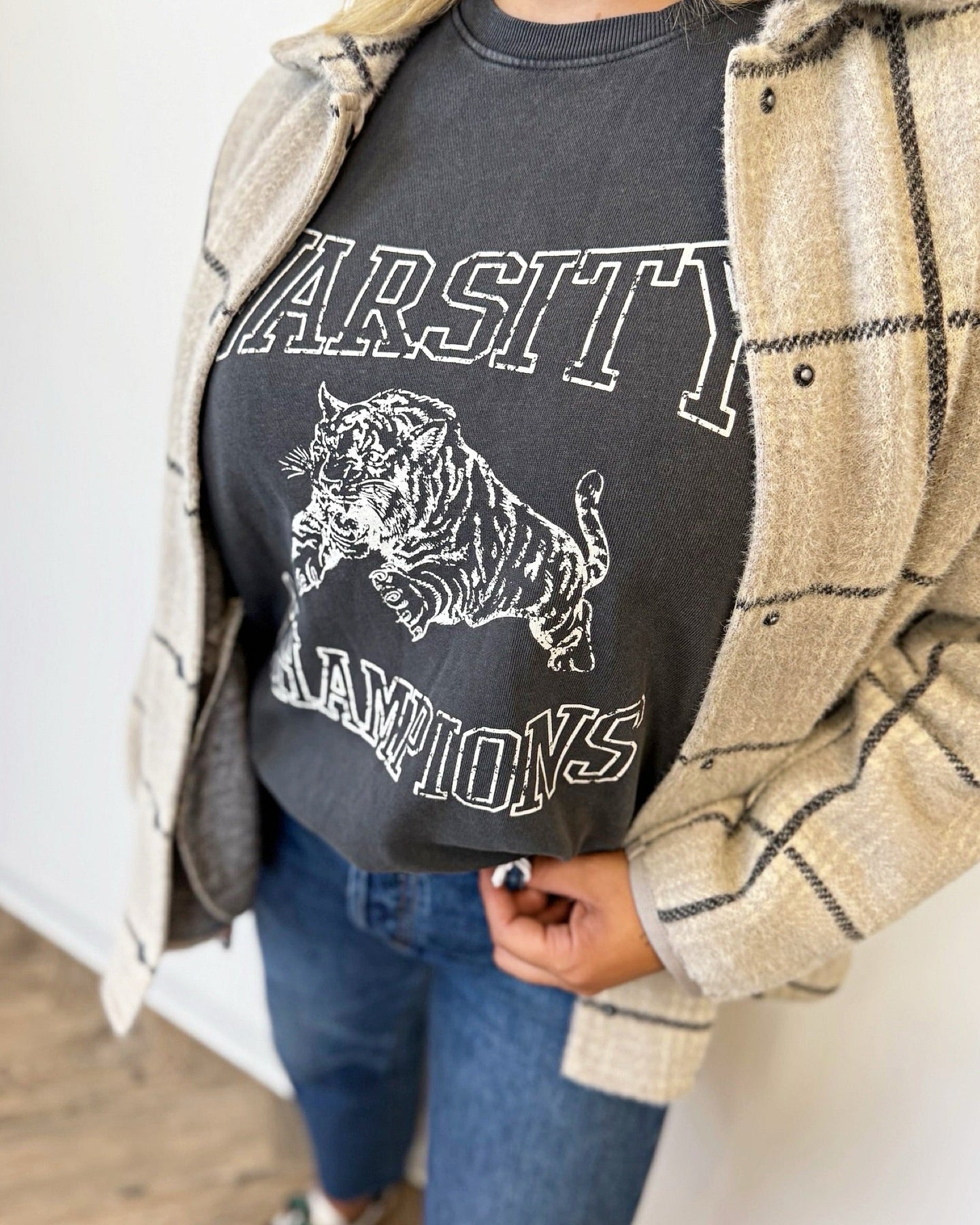 The Champions Oversized Sweatshirt offers a perfect blend of comfort and style with its roomy fit and midweight brushed 100% cotton fleece. Designed for relaxation, it features a vintage-wash finish and a distinctive “Varsity Champions” tiger graphic that adds a bold, classic vibe. Its crew neck and long sleeves ensure cozy warmth, making it an ideal layering piece. Easy to care for, this sweatshirt is machine washable and durable, perfect for elevating casual ensembles with effortless cool.