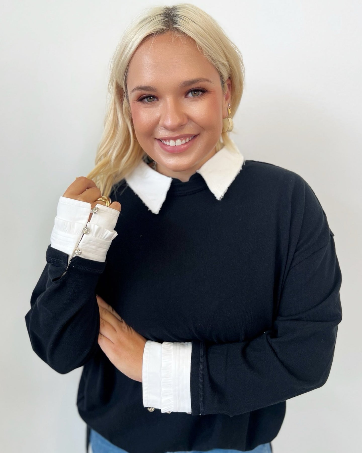 The Elias Oversized 2-in-1 Sweater offers a sophisticated, preppy look with its boxy, oversized fit and unique colorblock collar neckline. Designed with dropped shoulder seams and subtle frayed trimming, it delivers effortless style and versatility. Wear it as a chic top paired with jeans or balance its relaxed silhouette with a sleek midi skirt. For added flexibility, size up to layer it over tights as a dress or combine it with a skirt for a polished, multifunctional outfit. This sweater is an adaptable wardrobe essential for refined off-duty dressing.