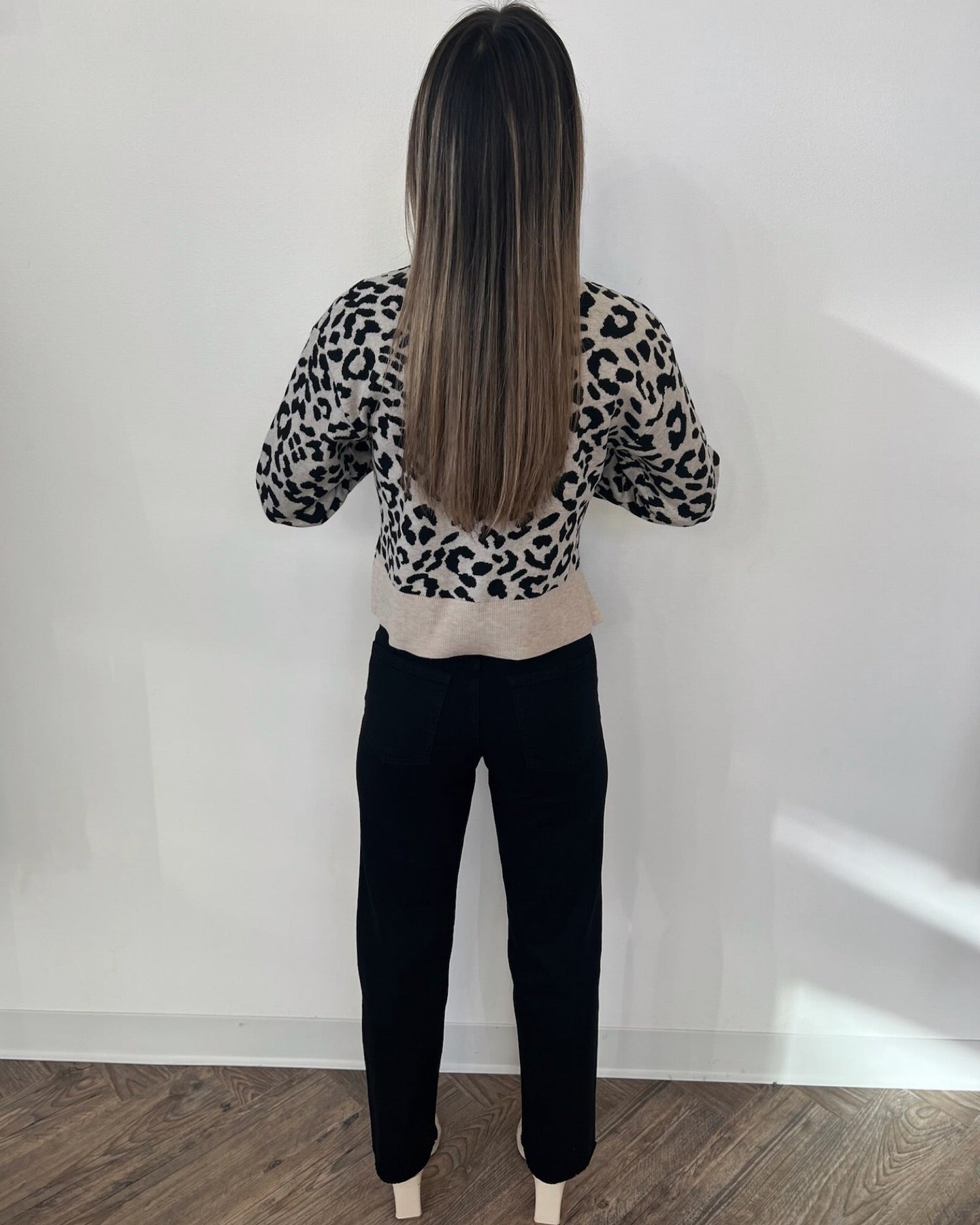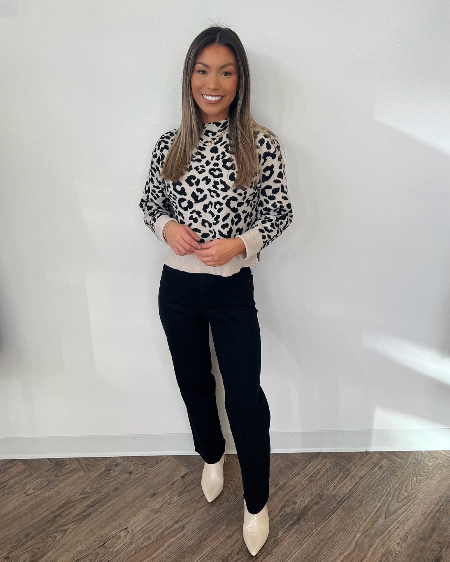 Elevate your wardrobe with the Dela Mock Neck Knit, featuring a trendy cheetah spot pattern for a bold, stylish edge. Its relaxed fit offers all-day comfort, while side vent slits enhance mobility and add subtle detail. Finished with a ribbed hemline and cuffs, this pullover balances casual ease with refined touches, making it perfect for versatile layering and effortless everyday wear.