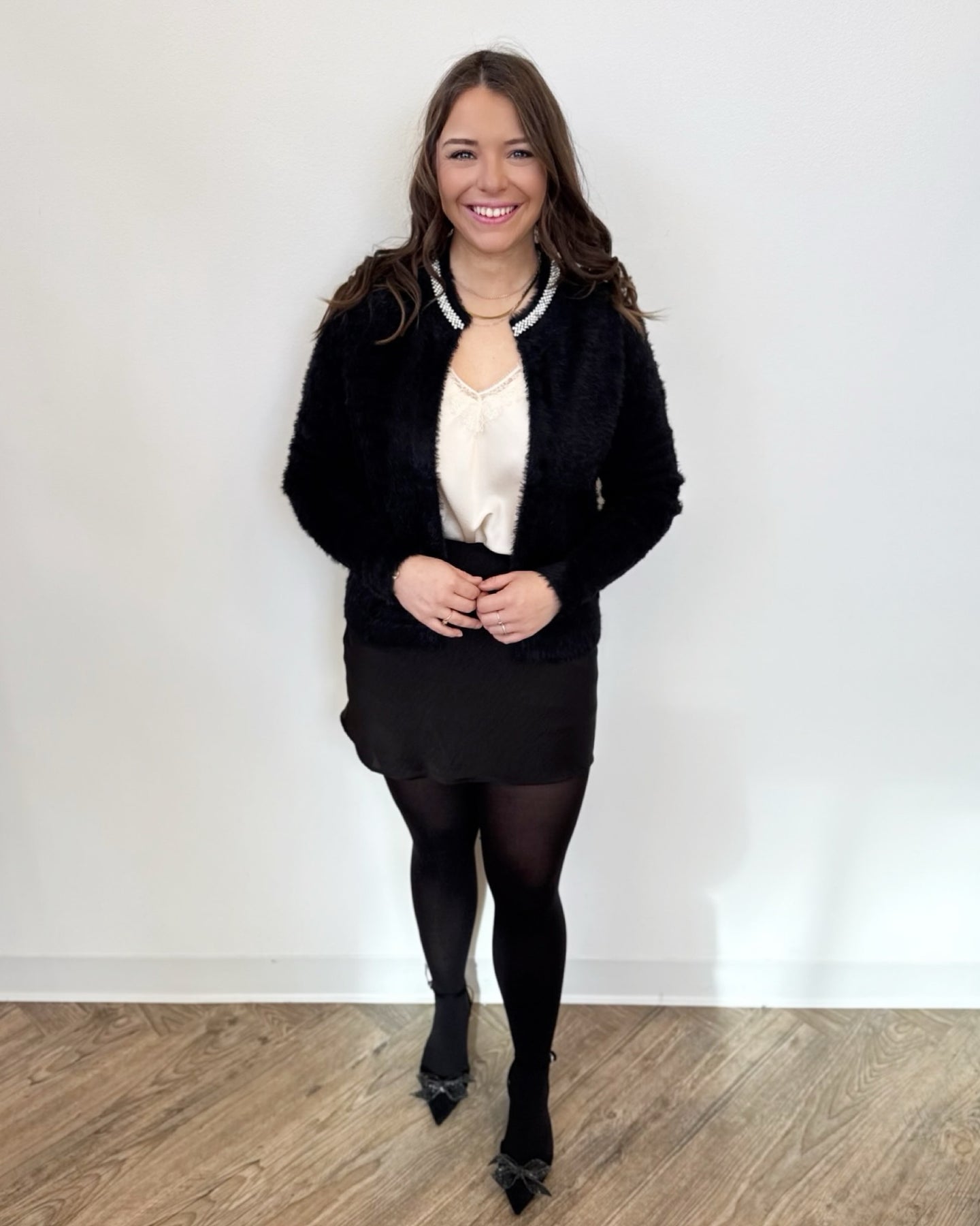 Elevate your holiday wardrobe with the Ginger Embellished Cardigan, where sophistication meets comfort. This stunning black cardigan features an intricate embellished neckline that catches the light beautifully, making it perfect for festive gatherings and special occasions. Crafted from luxuriously soft fabric, it drapes elegantly against your skin while providing the cozy warmth you crave during cooler months. Layer it over your favorite dress or pair it with tailored trousers for effortless polish. The refined embellishments add just the right touch of glamour without overwhelming your look, ensuring you'll feel confident and radiant all season long.