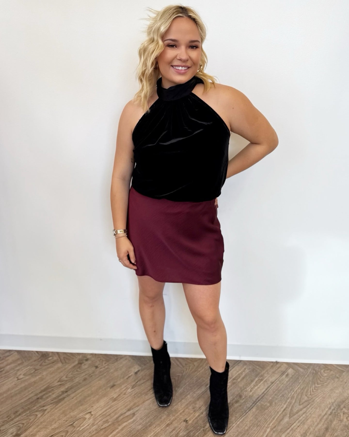 Elevate your holiday wardrobe with the Monroe Sleeveless Velvet Top, a sophisticated choice for festive celebrations. Crafted from luxurious velvet, this sleeveless halter design offers an elegant silhouette that commands attention. The charming bow tie detail at the back adds a playful touch of seasonal spirit while maintaining refined style. Perfect for holiday parties, cocktail events, or special gatherings, this top pairs effortlessly with your favorite skirts or trousers. Embrace the glamour and confidence that comes with wearing a piece designed to make you shine throughout the season.