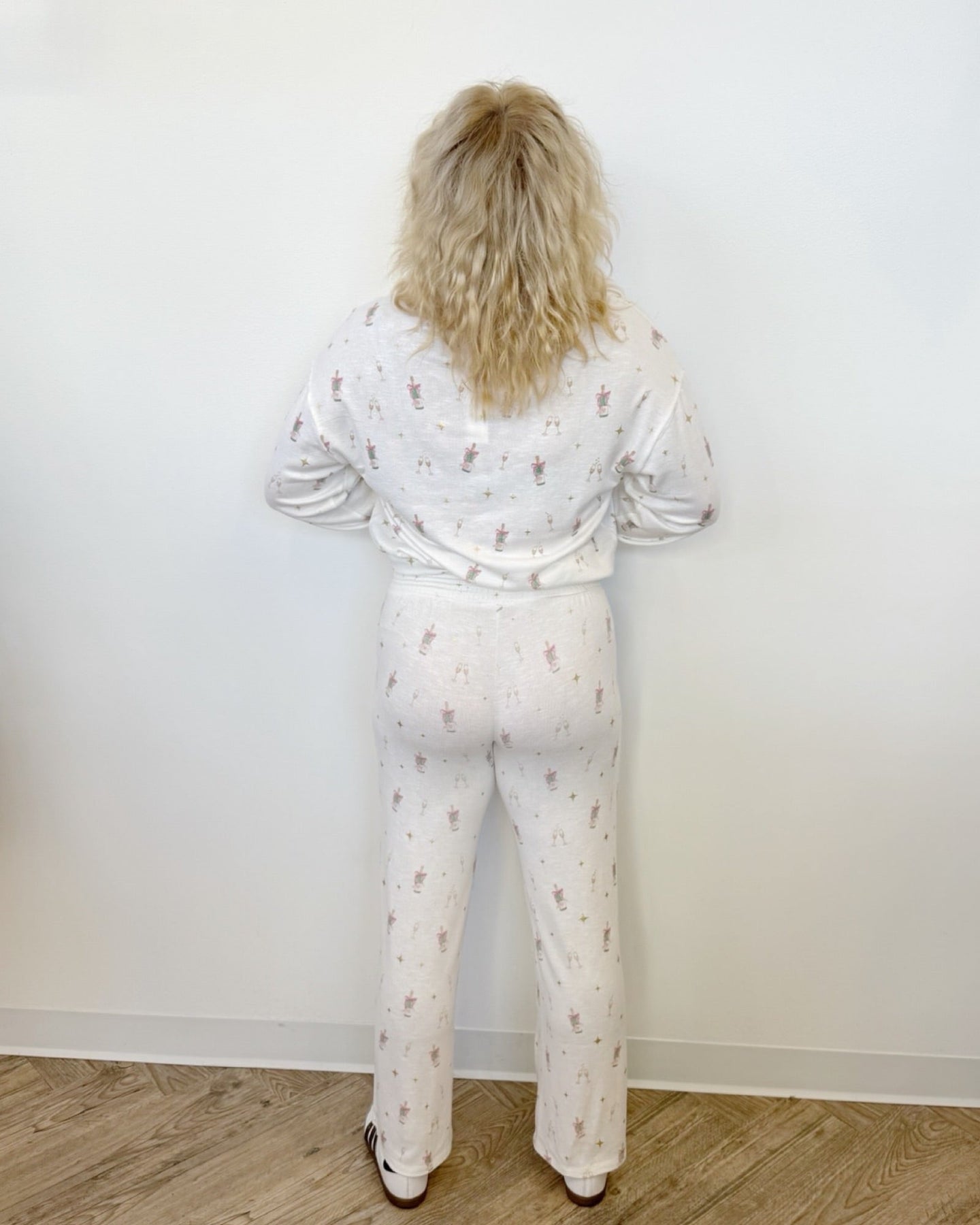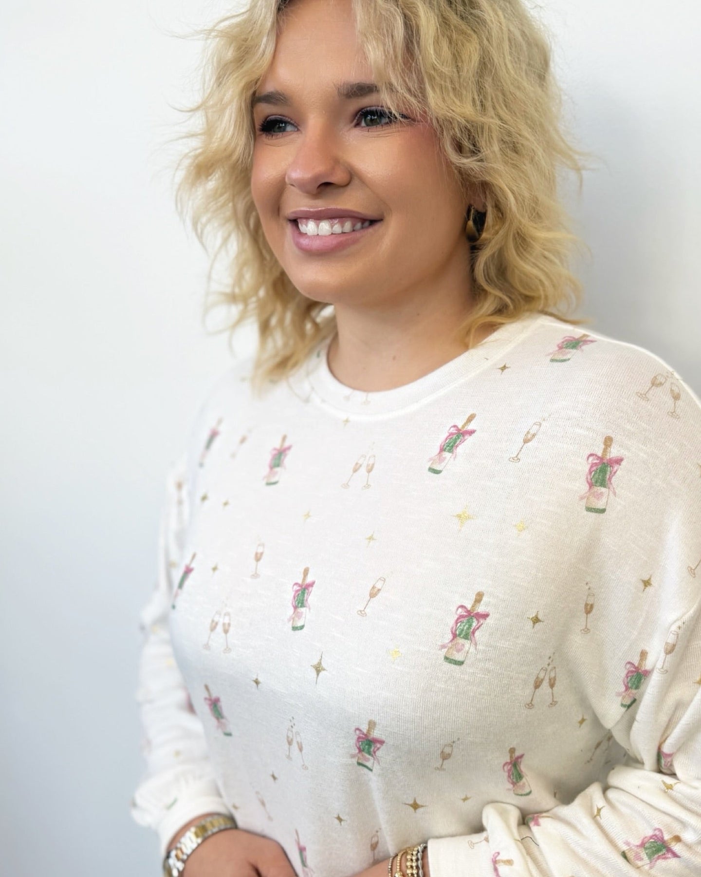 Celebrate life's best moments in this effortlessly chic lounge top. Featuring an all-over champagne toast print, the soft slub knit fabric invites you to unwind in style. With its relaxed fit, crew neck, and long sleeves, it's your new go-to for lazy mornings, cozy nights in, and everything in between. The heavy soft wash gives it that perfectly lived-in feel, while the gentle care instructions keep it looking fresh season after season. Comfort meets celebration in one irresistible piece.