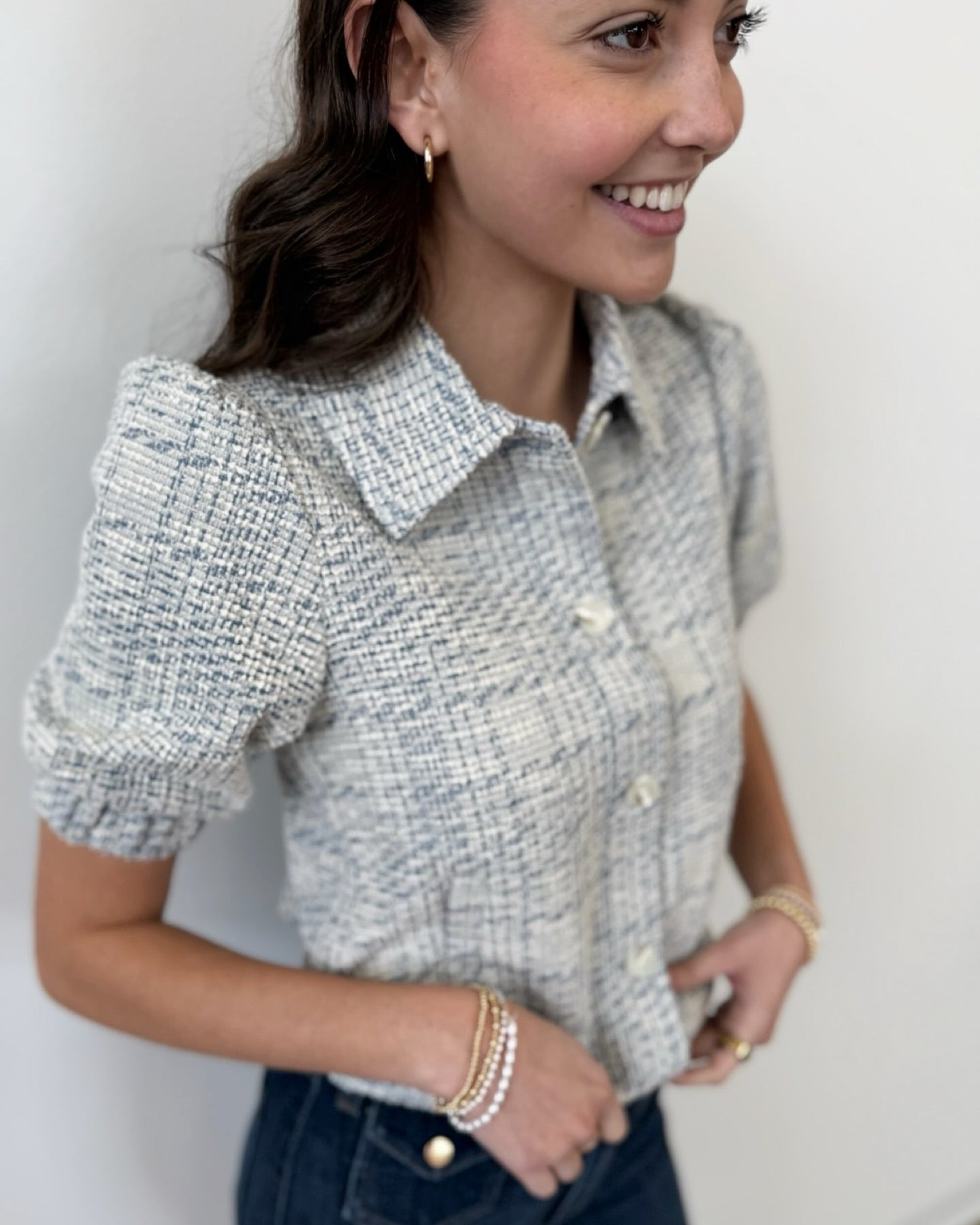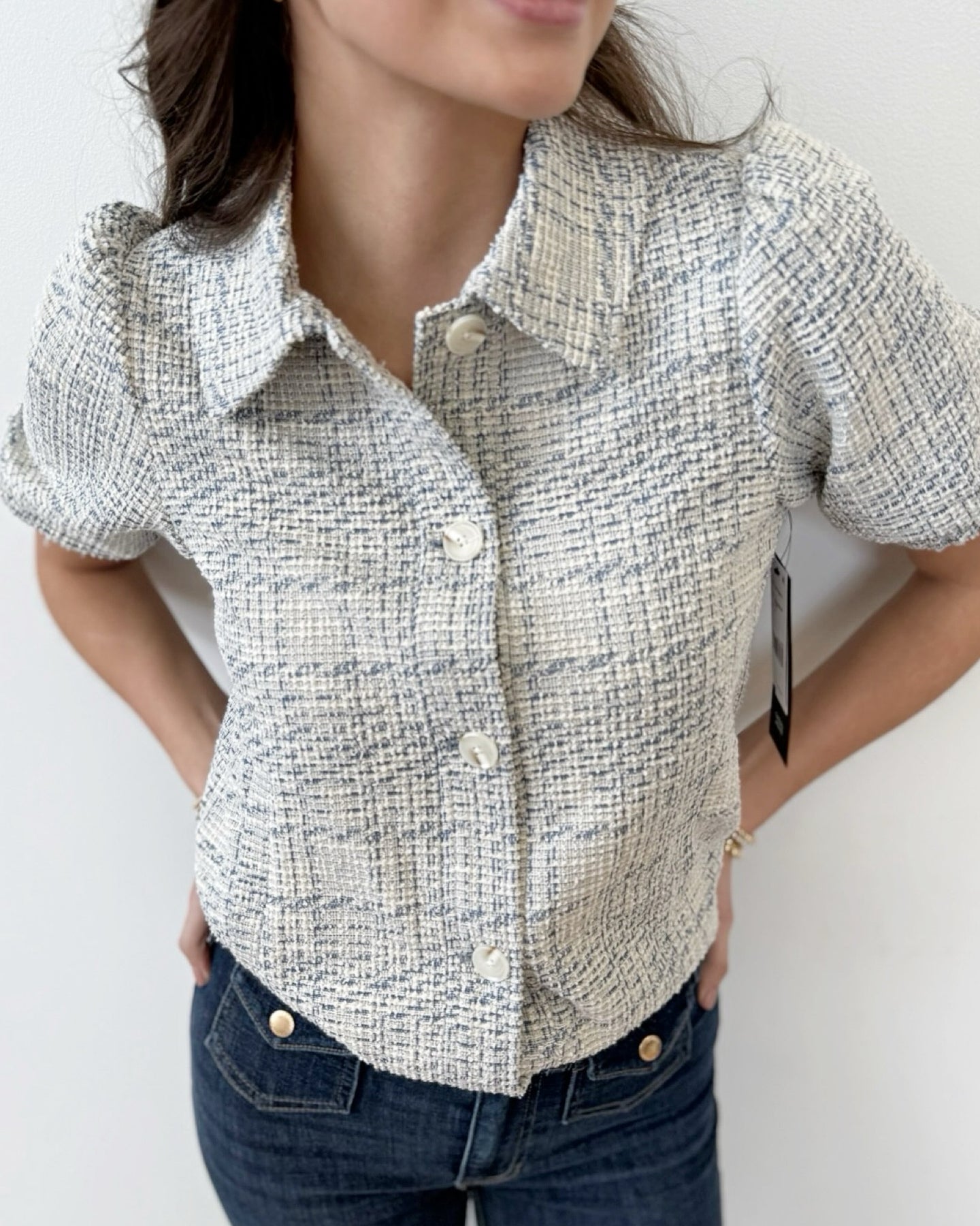 Elevate your everyday style with this Liverpool Los Angeles short-sleeve puff jacket, crafted from textured plaid boucle knit. Voluminous puff sleeves with elasticized hems create a modern, eye-catching silhouette that balances structure with playful charm. The classic button front and crisp collar deliver polished sophistication, while two front slant pockets add practical functionality. Fully lined for comfort and durability, this 22" jacket is the perfect layering piece that transitions seamlessly from casual to refined occasions.
