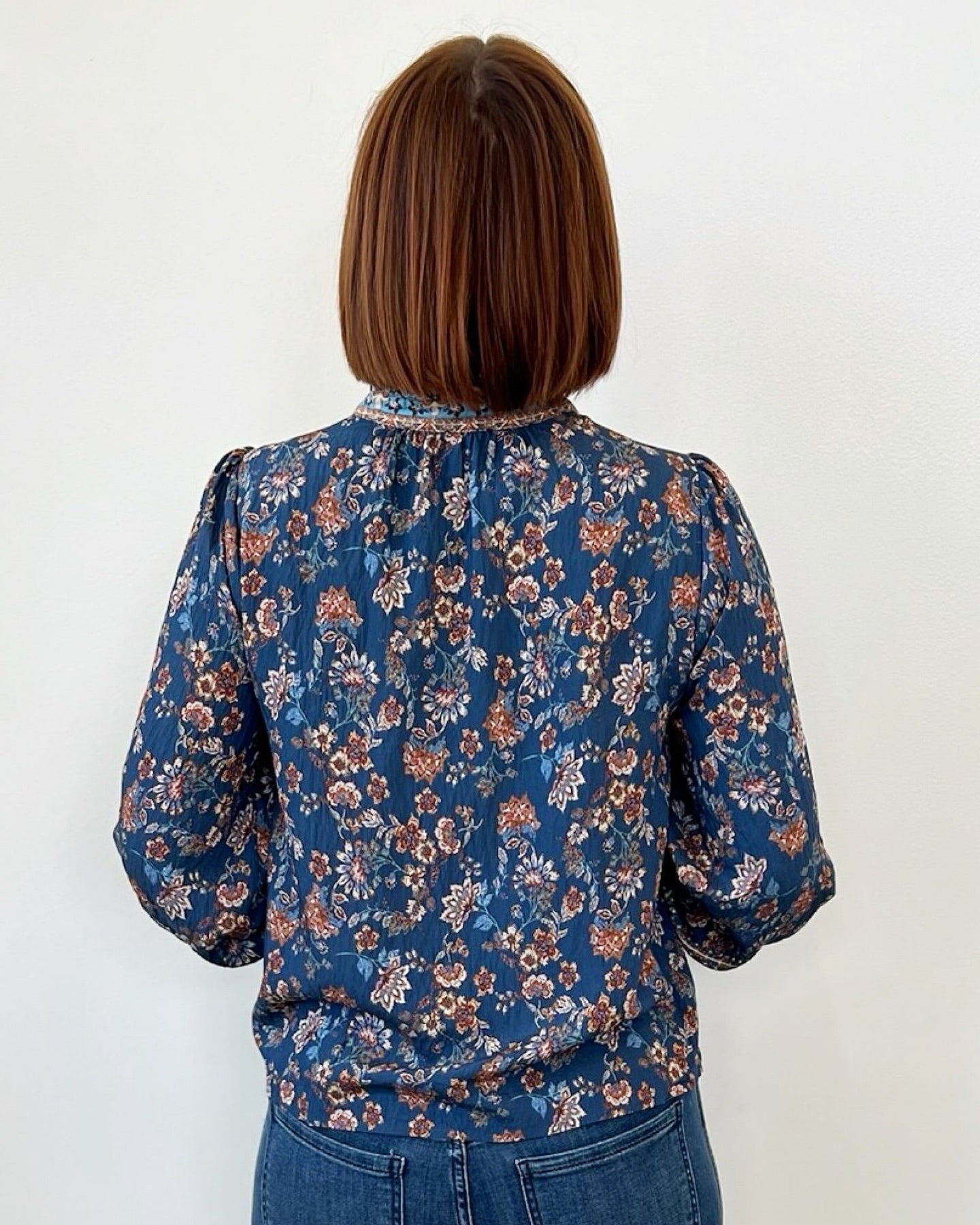 The Maisey Blouse commands attention with its daring ruffled mock neck and captivating blue and rust paisley print. Perfect for those who embrace bold style, this blouse effortlessly blends flair with elegance, making it a standout piece for any adventurous wardrobe.