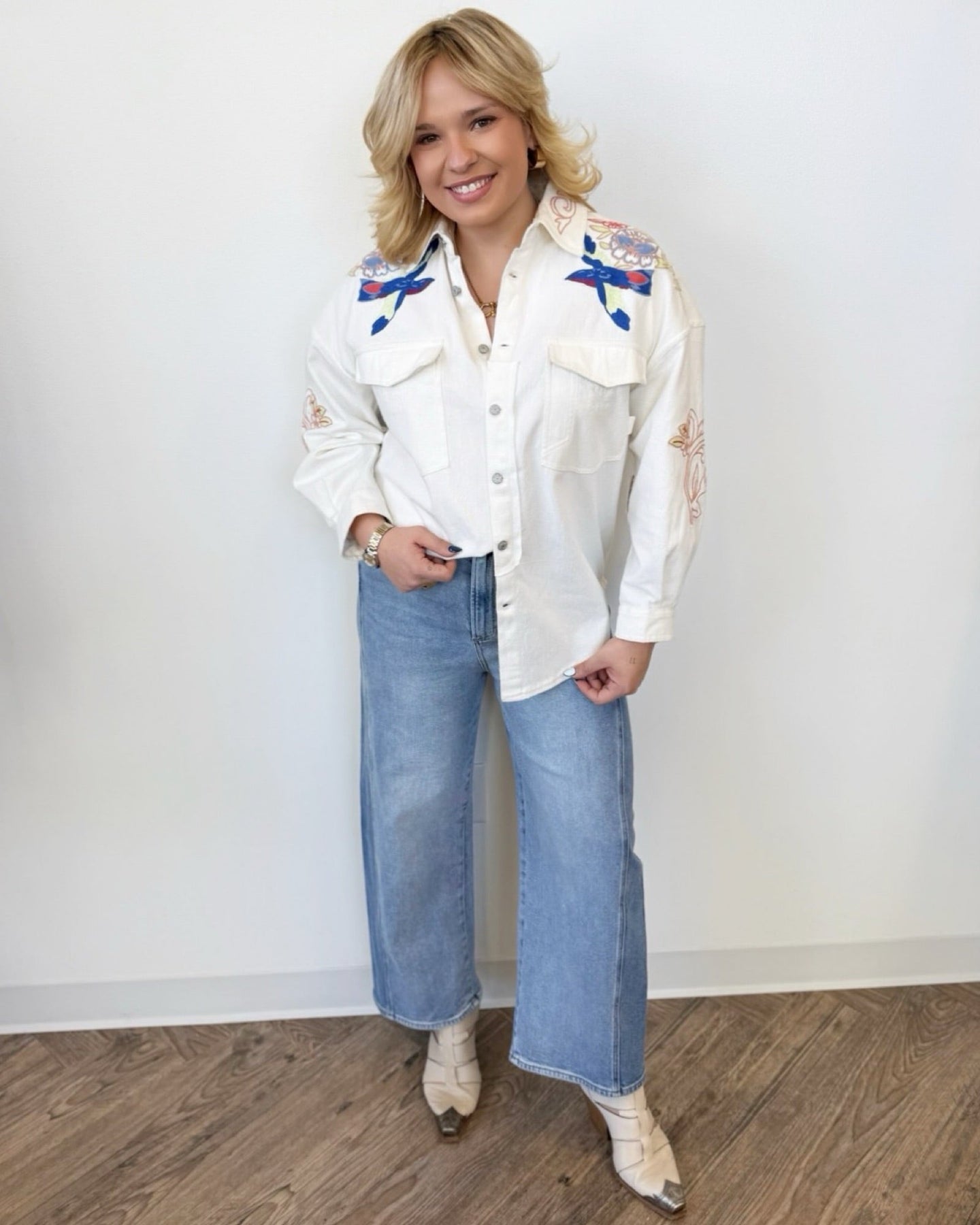 Embrace effortless elegance with this oversized button-down shirt, crafted from soft cotton for all-day comfort. The slouchy silhouette features dropped sleeves with finished cuffs, a collared neckline, and raw seaming for an intentionally relaxed aesthetic. A chest pocket and vibrant embroidery detailing elevate the design, transforming casual basics into a statement piece. Perfect for layering or wearing solo, this shirt seamlessly transitions from weekend errands to evening gatherings with understated sophistication.