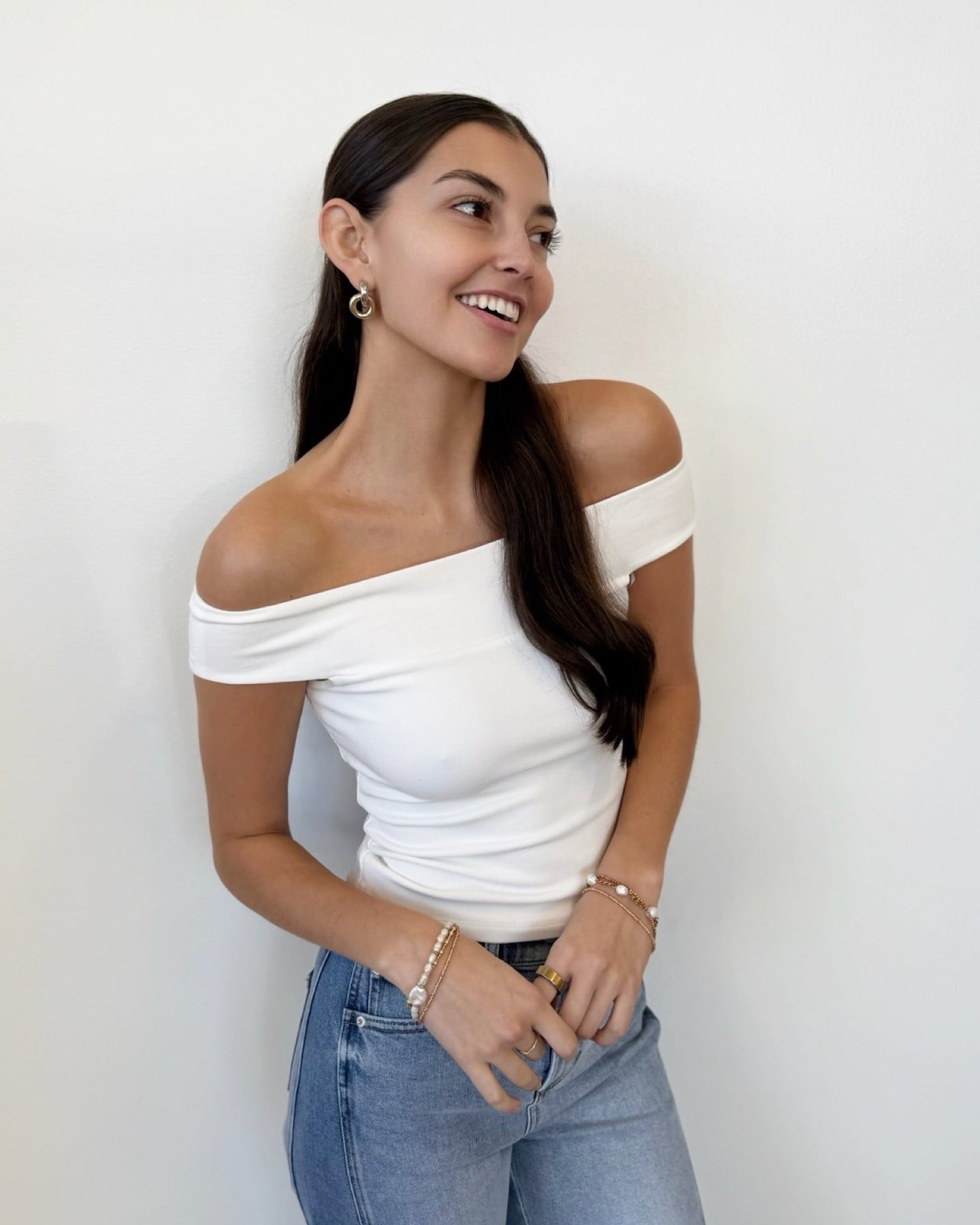 Effortless versatility meets everyday comfort in this lightweight ribbed essential. The off-shoulder silhouette offers a modern, flattering cut that works beautifully on its own or layered under jackets and blazers. Short sleeves and a fitted design create a polished look that transitions seamlessly from casual to dressed-up occasions. Perfect for building a wardrobe of timeless basics that adapt to your style.