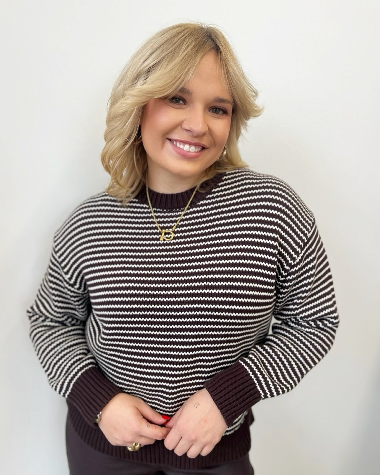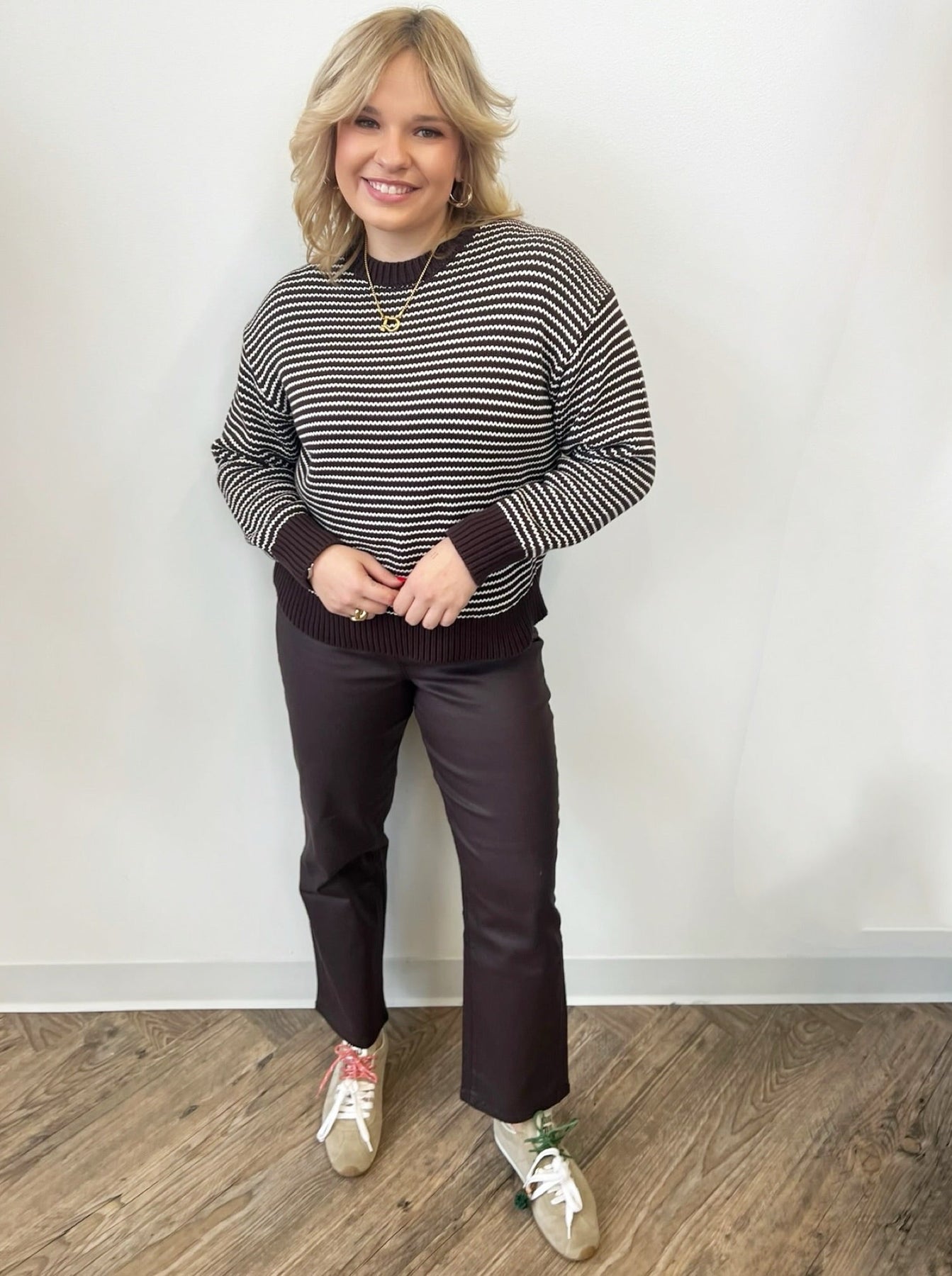 Introducing the Pistola Aura Relaxed Crew Neck Sweater—your new go-to for effortless comfort and timeless style. This relaxed-fit sweater features a luxuriously thick knit construction that feels as good as it looks, paired with a flattering drop shoulder silhouette for an easy, modern vibe. The sophisticated color blocking of rich espresso brown stripes against a soft eggshell base creates visual interest while remaining versatile enough to pair with virtually anything in your wardrobe.